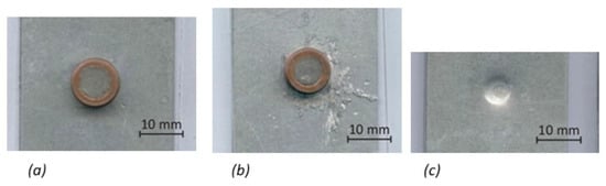 To assess the maximum strength of the soldered joint, a new series of test samples was prepared. The PMMA was replaced by an aluminum sheet. The change in the heat input was again ensured only by changing the heating time from 0.1 to 0.3 s. Since significant solder spatter occurred already at the heating time of 0.3 s (Figure 15c), the heating time of 0.4 s was no longer used. Therefore, for the purposes of the tensile test, three series of samples were made.