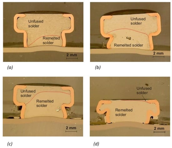 - At the lowest heat input, the volume of the remelted solder represented only 28% (of the total volume of the core of the bimetallic element); at the highest heat input it was 95%. With a volume of the remelted solder greater than 80% (heat input of above 952 J), a spattering of Sn60Pb40 solder was observed at the joint location, which can negatively affect the overall properties of the joint.