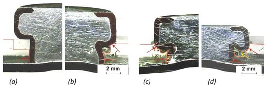 - The cross-sections of soldered joints made at different heating times with highlighted areas showing the force action between the element and the PMMA are shown in Figure 7.