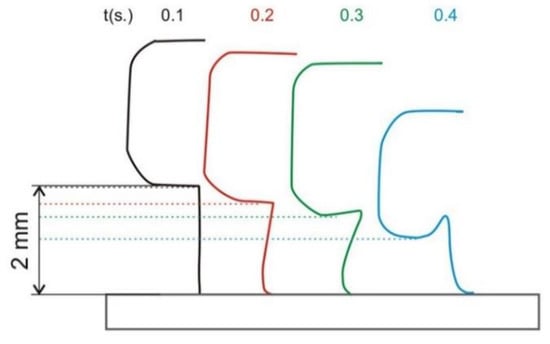 With the uniform distribution of the clamping force, the uniform deformation of the element occurred. At heating times of 0.1 to 0.3 s, the deformation was mainly manifested in the change in the length of the shaft of the element (Figure 8); at the heating time of 0.4 s, even the head of the element was significantly deformed (Figure 6d). At the lowest heat input during heating for 0.1 s, no deformation of the shaft of the element was noted. It remained at its original length of 2 mm. At the highest heat input during heating for 0.4 s, the shortening of the shaft of the element was the largest, decreasing from the original length of 2 mm to a length of 1.2 mm.