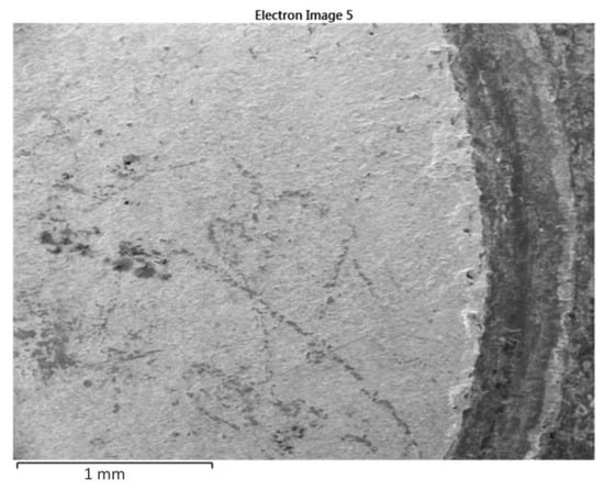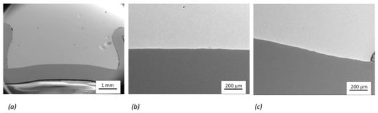 Figure 9 shows the cross-sections of the soldered joints. Local porosity in the structure of the bimetallic element can be observed. The pores are in the middle part of the shaft only in the volume of solder that was remelted during joining. The occurrence of pores in the soldered joint was not observed on any sample. Since only defect-free semi-finished products (tested through X-ray radiation) were used for the manufacturing of the bimetallic elements, we can assume that the appearance of pores was caused by the insufficient degassing of the flux from the molten solder during resistance heating. Despite the extremely fast temperature increase and short cooling time when using resistance soldering [], very good wetting of the base material (galvanized steel sheet) with the Sn60Pb40 solder from the bimetallic element can be seen at the joint (Figure 9a). Suitable wetting conditions were observed on the entire contact surface—in the middle (Figure 9b) as well as on the edges (Figure 9c).