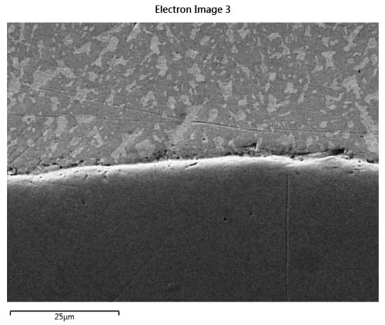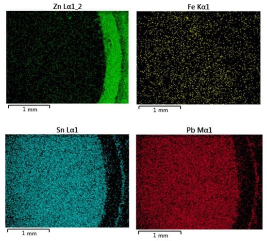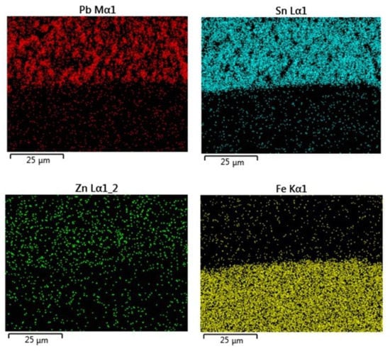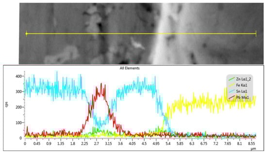 A detail of the solder/galvanized steel sheet interface is documented in Figure 10. Element distribution maps as well as a line analysis show a relatively sharp interface between the solder and the base material (Figure 11 and Figure 12). In the transition area, we noticed the dissolution of the Zn protective layer of the galvanized steel sheet by the molten solder. The thickness of the Zn protective layer on the steel sheet thus decreased from the original 15 μm to approximately 1.5 μm. In addition, there was a change in the chemical composition in the transition area, which was caused by the diffusion of Sn from the solder into the Zn coating (Figure 12).