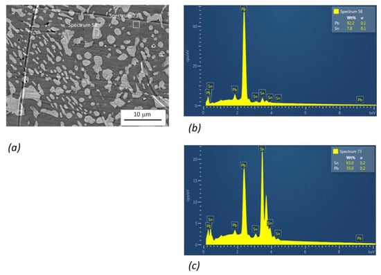 Structure of Sn60Pb40 solder (heating time of 0.3 s): (a) SEM image with marked areas for EDS analysis, (b) EDS analysis of “Spectrum 58”, and (c) EDS analysis of “Spectrum 73”.