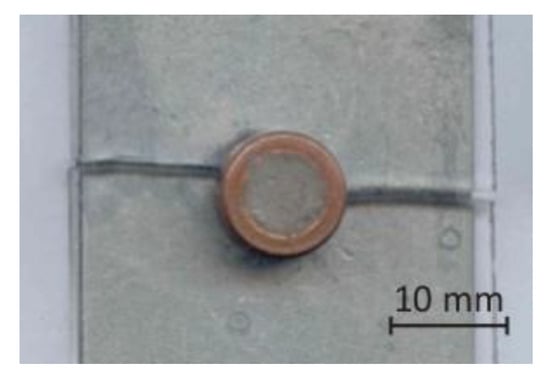 Before resistance soldering, the bimetallic element was inserted into a pre-drilled hole in PMMA, the steel sheet was cleaned with acetone, and SF-601 liquid flux was applied to the cleaned surface. This flux is mainly intended for soldering with tin solders and for soldering copper, nickel, their alloys, and some steels [].