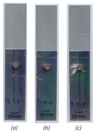 Detailed view of RES joints (steel/PMMA) with bimetallic element (Cu/Sn60Pb40): (a) front side of T10 (t = 0.2 s), (b) front side of T15 (t = 0.3 s), (c) reverse side of T15 (t = 0.3 s).