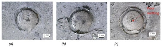 General view of RES joints (steel/aluminum) with bimetallic element (Cu/Sn60Pb40) from the face (front side): (a) t = 0.1 s, (b) t = 0.2 s, and (c) t = 0.3 s.