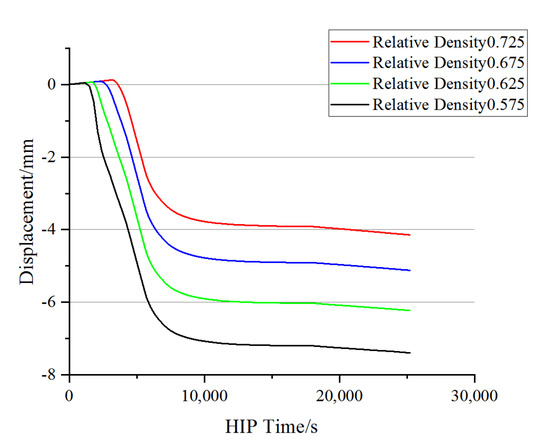 - A method for Ti6Al4V HIP simulation considering the non-uniform distribution of initial powder filling was developed. This method can effectively improve the accuracy of numerical simulation. The maximum relative error of the final displacement result is reduced from 4.2% to 3.16%.