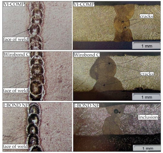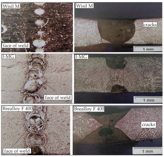The weld of Wisil M macroscopically shows a clean joint, polished after welding and without visible defects during welding. Microanalysis revealed an unwelded root of the weld and small, concentrated star-shaped cracks in the centre of the weld spot.