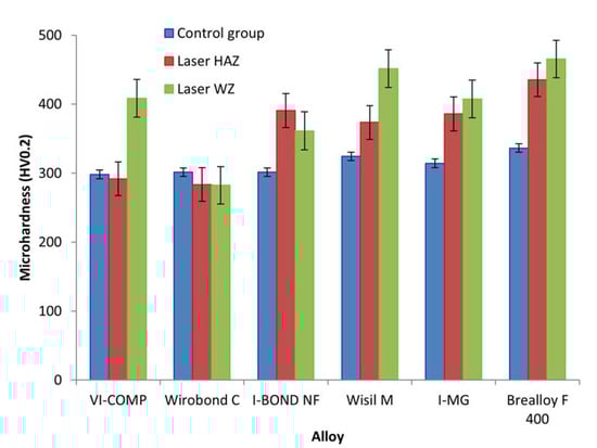 - The microhardness of the laser-welded alloys is in the range of 282–465 MPa in the weld zone and between 283 and 435 MPa in the heat-affected zone. Only the laser-welded Wirobond C had lower microhardness values than the control group,