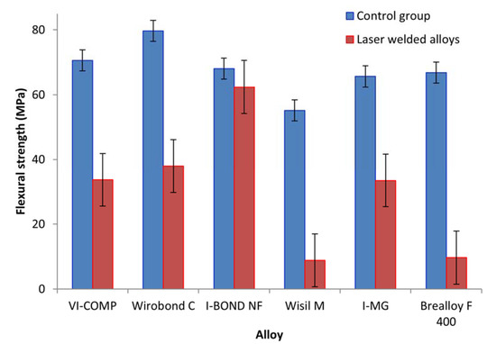 The flexural strength of the control group is significantly higher for all alloys except for I-BOND NF, where no statistically significant difference was found between the control group and the laser-welded alloys.