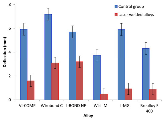 The influence of the welding type on the deflection is shown in Table 10. In the control group, the deflection is significantly higher than in the laser-welded alloys (5.5 mm on average compared to 1.7 mm).