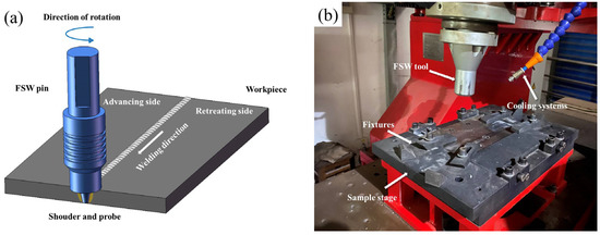 (a) Schematic illustrations of the FSW process. (b) View of the FSW machine.
