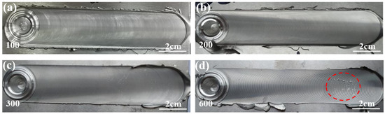 Figure 3 shows the surface morphology of the joints at the welding speeds of 100 mm/min, 200 mm/min, 300 mm/min and 600 mm/min. The flash defect, which existed on both sides of the weld, gradually disappeared as welding speeds increased. A small amount of spilled flash formed debris under the cutting action of the shoulder, as shown in Figure 3d. The higher volumes of flash would reduce utilization of materials and add additional post-processing. The center of the weld consisted of a corrugated arc pattern, which increased in spacing as the welding speed increased. In addition, no common surface defects were observed in the welds such as cracks, grooves or lack of filler on the surface.