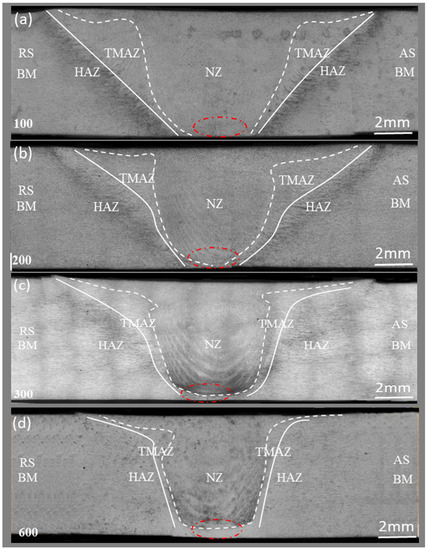 The cross-section macroscopic morphologies of the welded joints at various welding speeds are shown in Figure 4. The middle region of the weld was the nugget zone (NZ), outwardly in the order of the advancing side-thermo mechanically affected zone (AS-TMAZ), retreating side-affected zone (RS-TMAZ), heat-affected zone (HAZ) and BM. The NZ was all trumpet-shaped, with a broader area of shoulder influence zone at the top of the NZ and a narrower area of pin influence zone at the root part of the NZ. The laminar accumulation of tissue in the pin influence zone was termed as the onion ring. In addition to the joints obtained at 100 mm/min, some undisturbed grains appeared at the root of the NZ. The spacing between onion rings, similar to the arc-shaped patterns, increased with the increase in welding speeds. As the welding speed increased, the size of the NZ gradually converged to the shape of the FSW tool; when the welding speeds reached 600 mm/min, the shape of the pin influence zone was extremely different compared with the other parameters (Figure 4c).