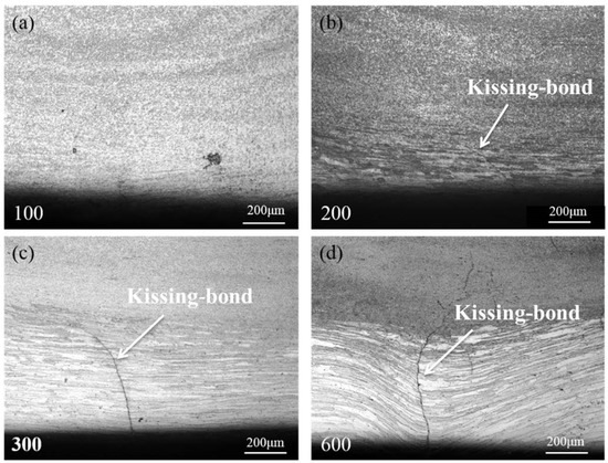 Figure 5 shows a partial enlargement of the red circle area at the bottom of Figure 4. No defect was found at the bottom of the joints at the welding speed of 100 mm/min and the plates formed an effective connection between them. But, when the welding speed reached 200 mm/min, it was found that the deformation microstructure was retained as an elongated grain without undergoing dynamic recrystallization and a kissing bond appeared at the root of the joints. The kissing bond mostly consisted of micropores and microcracks; at the same time, the direction of its extension became more and more perpendicular to the horizontal direction. Table 1 illustrates the length of the kissing bond in the joints at different welding speeds. With the welding speed increasing from 100 mm/min to 600 mm/min, the length of the kissing bond grew up to 0.72 mm. Obviously, the length of the kissing bond was proportional to the welding speeds; especially, the joints with the welding speed of 600 mm/min, the kissing bond defect extended into the center of the NZ. The kissing bond was caused by insufficient heat input during welding, resulting in the joints forming a tight contact at the bottom with an ineffective connection [29]. When the joints were subjected to the transverse tensile stress along the weld, it was easy to cause stress concentrations and fractures in the weak regions, which would significantly reduce the mechanical properties of the joints [30].