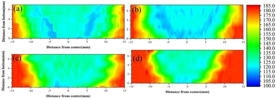 Cross−sectional microhardness distribution of the joints by different welding speeds: (a) 100 mm/min, (b) 200 mm/min, (c) 300 mm/min and (d) 600 mm/min.