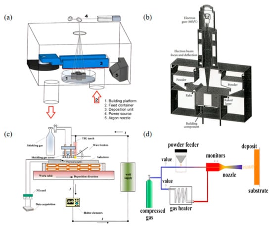 Working principle of: (a) SLM [22] (b) EBM [23] (c) WAAM [24], and (d) CSAM [25].