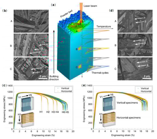 On the other hand, initial efforts have been made to design SLMed unique alloys. For example, Zhang et al. [35] adopted a collaborative alloy design method and printed titanium alloys with layered α + β in each layer by adding pure titanium powder and iron oxide nanoparticles into Ti6Al4V raw material through in situ alloying, as shown in Figure 2. The anisotropy of mechanical properties caused by the thermal gradient and different microstructures between thermal history cambium layers is overcome. Zhang et al. [34] added a small amount of 316L stainless steel to Ti6Al4V by in situ alloying. Micron-scale modulation of the elements contained in 316L of Ti–6Al–4V matrix formed, a fine-scale modulated β + α’ dual-phase microstructure with a high tensile strength of about 1.3 gigapascals, elongation of 9%, and excellent working hardening mechanical properties of >300 MPa. These successes demonstrate the great potential of in situ alloying to modulate the microstructure of unique SLMed titanium alloys, which plays an important guiding role for subsequent research directions.