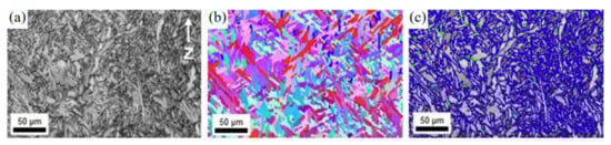 EBSD maps for the as-fabricated EBAM Ti-6Al-4V samples: (a) image quality maps, where the light values indicate high image quality; (b) EBSD orientation maps from different samples; (c) the grain boundary map [64].