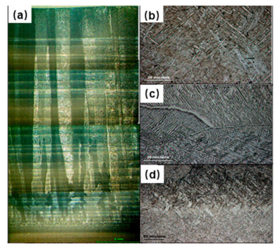 (a–d) Microstructure of the as-deposited Ti-6Al-4V by WAAM [76].