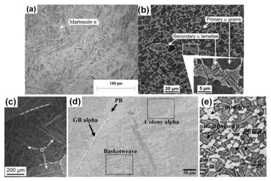 The microstructure under different cooling processes: (a) martensite α’[85], (b) needle-like secondary α [82], (c) martensite α” [83], (d) grain boundary α + fine basket-weave structure (Widmanstätten α) [81], and (e) acicular α[76].