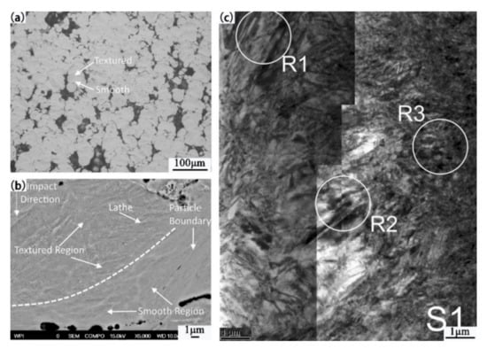 Microstructure characterization of the cold-sprayed Ti6Al4V deposits with nitrogen at 790 °C and 3.6 MPa: (a) OM image of an etched cross-section showing small bands of the smooth transformation region; (b) SEM-BEI of a cross-section showing in detail the smooth region and the textured region; (c) TEM image of sample S1 taken from the particle interface zone showing a disorganized and broken structure (R1), an organized and stacked lamellar structure (R2), and a fine-grained structure (R3) [103].