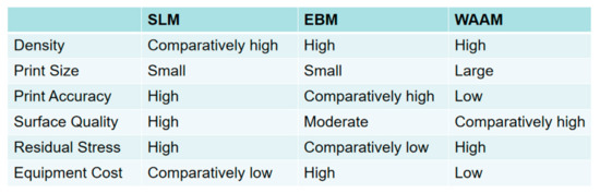 The characteristics of SLM, EBM, and WAAM processes [108,109].