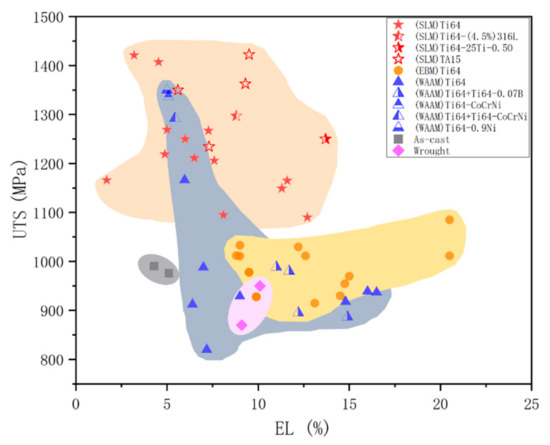 Figure 11 presents the mechanical properties of the three methods and cast-forged titanium alloys, including ultimate tensile strength (UTS) and elongation (EL). As can be seen from Figure 11, SLM can print titanium alloys with the highest ultimate tensile strength, but the lowest ductility. In addition, the unique titanium alloys designed by in situ alloying have great potentials for achieving better mechanical properties; EBM-printed titanium alloys harvest the highest ductility while taking into account the high ultimate tensile strength; The titanium alloys printed by WAAM can achieve higher ductility but lower ultimate tensile strength after parameter optimization. At the same time, the layered design and microelement doping of WAAMed titanium alloy show the possibility of improving ductility and ultimate tensile strength, respectively. As shown in Table 5, the CSAM method is not yet able to print titanium alloys with performance up to industry standards, and there is still a lot of room for improvement.
