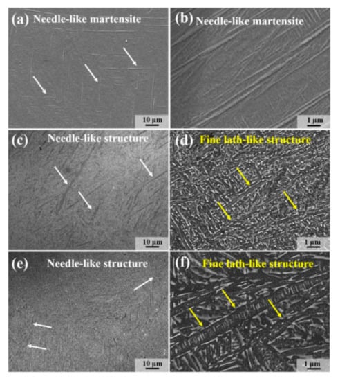 Microstructures of untreated samples and heat-treated TA15 in the partial martensitic decomposition temperature range: (a,b) untreated, (c,d) 2 h at 650 °C and (e,f) 2 h at 750 °C. White and yellow arrows indicate needle-like structures and lath-like structures, respectively [36].