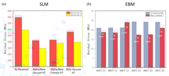 Effect of post-heat treatment on residual stress: (a) SLM, (b) EBM [124,125].
