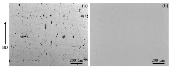 Optical micrographs presenting defects. (a) EBM parts with obvious defects. (b) Optical microstructure after HIP [134].
