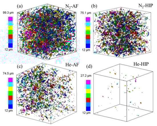 3D-reconstruction of the pores within the CS Ti6Al4V samples under different conditions: (a) N2-AF, (b) N2-HIP, (c) He-AF, and (d) He-HIP; the color scale bar corresponds to the equivalent diameter of the reconstructed pores [135].
