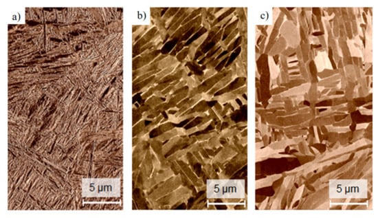 Ti64 has been extensively studied because of its excellent performance and biocompatibility, and EBM has become one of the main additive manufacturing methods for printing Ti64. Better printing performance of Ti64 can be achieved by exploring the microstructure of EBMed Ti64. In the process of EBM manufacturing, the preheating environment of 650 °C to 750 °C and the characteristics of slow cooling lead to the decomposition of the martensitic phase, forming α and β phase structures dominated by the α grain boundary and transformed α/β structure, and the grain is filled with the original β grain with a Widmanstätten structure and a lamellar structure (Figure 3 and Figure 4) [56,57]. This microstructure differs entirely from the α’ and β phase microstructure of SLMed titanium alloys. Preheating also plays a role in stress relief, which is conducive to a good match of strength, plasticity, and performance consistency of EBM-manufactured parts [58,59]. Table 3 shows the mechanical properties of EBMed titanium alloys, compared with forged samples, the tensile strength, yield strength, and elongation of EBMed titanium alloy samples increased by 19%, 12%, and 49%, respectively [60]. Because EBMed titanium alloys do not have α’ martensite, the ultimate tensile strength is reduced, but the ductility is improved, with sub-high strength and high ductility. Wang et al. [61] revealed the possibility of overcoming the strength-ductility tradeoff of titanium alloys through additive manufacturing, and the α-strip width in their microstructure is important for the deformation mechanism of Ti64 samples constructed by EBM. Deformation-induced nanoscale twins were observed at room temperature with an average width of 0.6 μm for the α strips, which resulted in high yield strength and ultimate tensile strength as well as remarkable ductility. In contrast, when the average width of α slats was about 0.2–0.3 μm, the fine microstructure specimens with a low working hardening rate only exhibited dislocation plasticity. These findings provide insights into the microstructure-dependent deformation mechanism of manufactured Ti-6Al-4V.