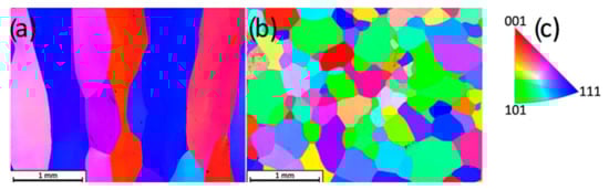 EBSD images of the columnar as-deposited region (a) and the recrystallized grains (b) of the WAAMed sample. (c) Legend with regard to color and orientation [138].