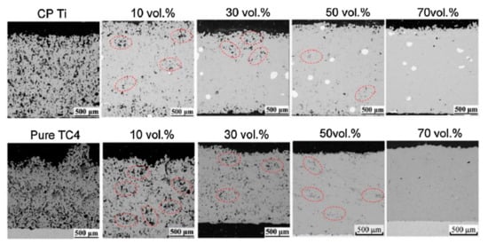 As a new emerging process, CSAM exhibits great potentials; however, thee CSAM printed products still suffer from quality problems. CS was originally used for the metal coating process. Recently, it has been proposed as a new additive method for metal manufacturing. The above methods are based on the fusion-solidification principle for printing titanium alloys. The high-temperature process is usually associated with some defects, such as metallurgical defects, tensile residual stresses, cracks, and deformation. Compared with the melting process, CSAM has the advantages of shortening production time, an unlimited product size, and high flexibility. Meanwhile, the sprayed particles of CSAM are characterized by low temperature, high speed, and low oxidation, thus having attracted increasing attention in the industry [99,100]. When applied to print titanium alloys, however, this method still faces significant challenges. Because of its high melting point and high strength, it is challenging for titanium base particles to produce thermoplastic deformation in the cold spraying process. As a result, the critical rate of successful deposition of Ti and its alloys is generally higher than that of most metals (e.g., over 1000 m/s for Ti6Al4V) [101,102], which also results in cold spray titania-based deposits that are often porous, as shown in Figure 7. The current state of cold spray additive manufacturing (CSAM) for printing titanium alloys shows promising advancements in various industries, such as aerospace, automotive, and healthcare. CSAM has demonstrated its capability to produce high-quality titanium alloy components with improved mechanical properties and complex geometries, paving the way for potential applications in lightweight structures, wear-resistant parts, and medical implants. However, further research and development are required to optimize process parameters, enhance material properties, and ensure reliable and cost-effective production in industrial settings.