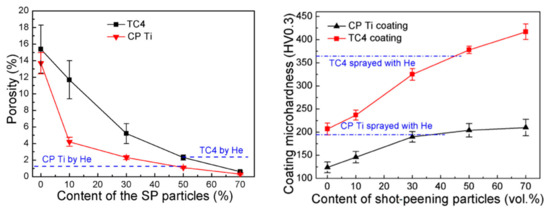 However, the high-speed impact of particles is a very basic and normal process in the CSAM process, which does not have special requirements on the depth of the effect of shot peening technology and avoids its limitations. In addition, the large-particle shot peening technology can effectively play a tamping role in tamping the deposited layer [144]. Based on the findings presented in Figure 20, it is evident that during the CSAM process, the particles undergo deformation upon impact with the substrate. However, under the influence of the shot peening process, the larger particles cause secondary deformation of the deformed particles, resulting in compaction. This compaction effect greatly reduces the porosity of the printed products. Luo et al. [145] first studied the effect of in situ shot peening on cold sprayed Ti and Ti6Al4V sediments and experimentally explored the effect of SP particles of different proportions (0, 10, and 70 vol.%) on porosity and microhardness. As depicted in Figure 21, the density of both Ti and Ti-6Al-4V deposits increases with an increase in the SP (Shot Peening) particle content, reaching its maximum value at the highest proportion of SP particles. This phenomenon can be attributed to the increased content of SP particles, which leads to a greater compaction effect and therefore an enhanced density of the products. The trends in product density and microhardness variations with increasing SP particle content can be observed in Figure 22. It can be seen that the porosity was inversely proportional to the SP particle content, and this effect was more obvious under low SP particle content. When the SP particle content increased to 70 vol.%, the porosity of Ti and Ti6Al4V sediments decreased to 0.3% and 0.7%, respectively. The microhardness of Ti and Ti6Al4V sediments increased to 203 HV and 427 HV, respectively. It can be inferred from these results that customized compact sedimentary beds with low porosity and high microhardness can be prepared by selecting an appropriate proportion of SP particles. In summary, shot peening is more suitable for the CSAM process, which can effectively reduce the porosity of printed titanium alloys and improve their microhardness.