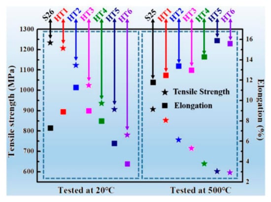 As the most common post-processing method, PSHT has been widely used in the post-processing of AMed titanium alloys. Due to the decomposition of the α’ martensitic phase in the PSHT process and the subsequent increase of β phase content, the ultimate tensile strength of titanium alloys decreases and the ductility increases after PSHT (Figure 23). An appropriate PSHT temperature can optimize the microstructure of titanium alloys and achieve the optimal combination of ultimate tensile strength and ductility. At the same time, reheating can release residual stress and reduce the residual stress accumulated by rapid cooling in SLM, EBM, and WAAM printing processes. The ultimate tensile strength and ductility of CSAMed titanium alloys can be effectively improved by the better adhesion of CSAMed titanium alloys in the deposit after PSHT, as shown in Figure 24. Therefore, PSHT is generally applicable to various AM printing methods for titanium alloys.