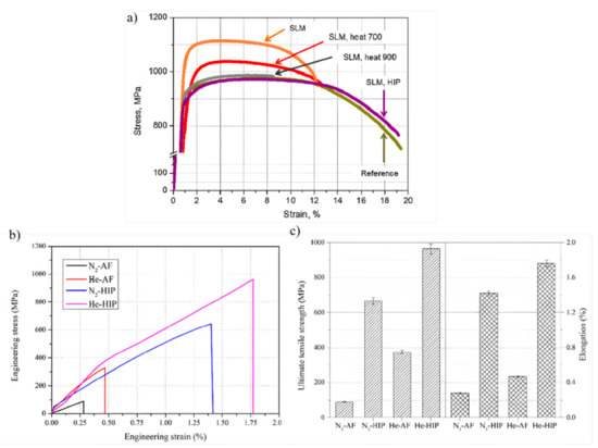 For the CSAM process, unlike SLM and WAAM, post-heat treatment can promote adhesion in the sediment, resulting in increased tensile strength and ductility. After PSHT treatment at 600 °C for 2 h, the tensile strength of cold-sprayed Ti6Al4V sediments increased by 72% to 765 MPa when helium was used [126]. However, the tensile strength for sediments produced using nitrogen remained relatively low (462 MPa) even after 4h of PSHT treatment at 1000 °C due to the large porosity. These results indicate that PSHT can improve the tensile strength of cold-sprayed titanium alloy deposits with low porosity [126,127]. Therefore, PSHT reduces residual stress, eliminates martensitic SLM and WAAM, and promotes the adhesion of CSAM-printed titanium alloys.
