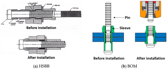 Huck BOM-bolts were developed by Huck International and consist of a pin and a sleeve, both made of carbon steel. BOM bolts have the advantage of high tensile and shear load capacity and precise mounting positioning, making them suitable for critical joints in structures, and are environmentally safer than welding and more efficient and easier to install than conventional bolts. Figure 3 shows the construction of a BOM-bolt before and after installation.