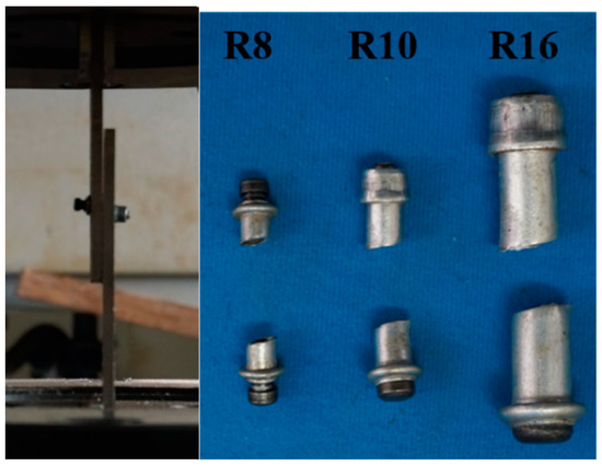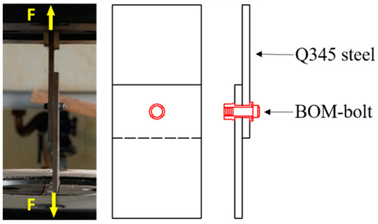 The tests included three different bolt diameters of BOM-bolts, and three specimens of each specification were set up for nine specimens. The specific parameter settings are listed in Table 1. The material of the connection plate used for the test was Q355 steel. The purpose of the tests was to investigate the shear load capacity and damage mode of the bolts. The tests were conducted on a universal testing machine of which the setup and specimen design diagrams are shown in Figure 4 and Figure 5.