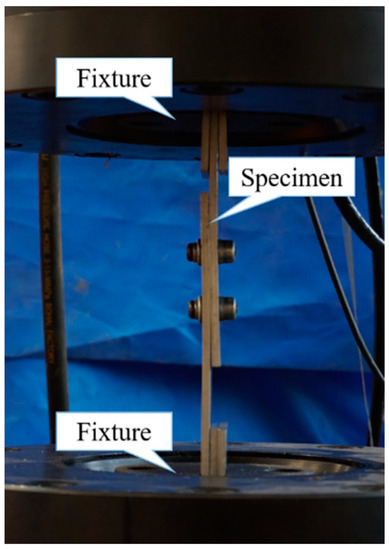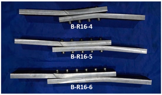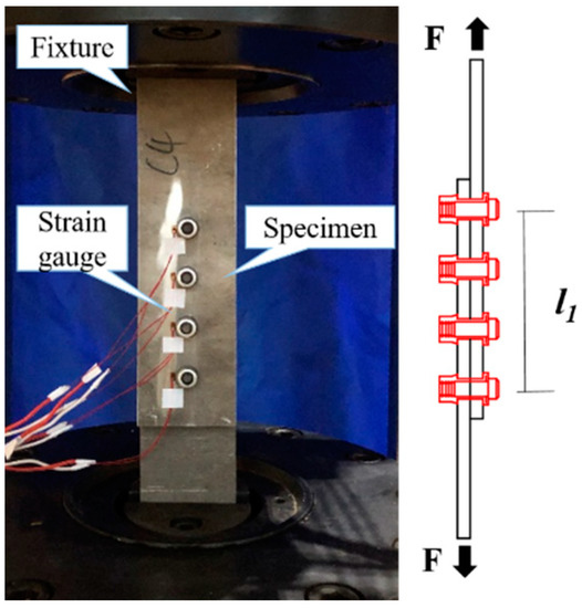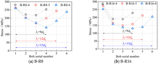 The test included two different bolt diameters and three bolt connection lengths. One specimen was set up for each specification, making a total of six specimens. The material of the connection plate used for the test was 6061-T6 Al alloy. The specific parameter settings, test setup and specimen design are shown in Table 3 and Figure 7. The damage pattern of the specimen shown in Figure 8 was that the aluminum plate was pulled off from the bolt hole at the edge, and the BOM bolts showed no significant deformation. The stress distribution in each bolt hole at the end of the elastic phase of the specimen shown in Figure 9 could be calculated from the measured strain data. There was an obvious unevenness in the stress on the bolts in the elastic phase of each specimen, and the degree of unevenness increased with the increasing length of the connection. The closer the bolt was to both ends, the greater the stress was.
