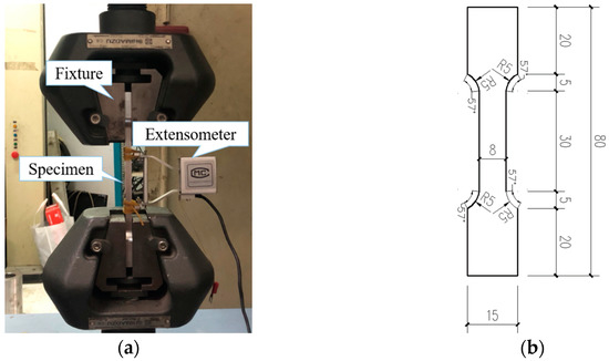 Material tests of aluminum alloy connecting plate. (a) Loading and measuring device. (b) Specimen size.