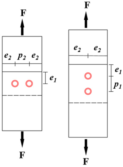 The research on the shear properties of ordinary and high-strength steel bolts shows that the bolt distance affects the bearing resistance of the bolted connection [24,25,26,27,28]. The formulae for calculating the degree of influence of bolt spacing on bearing resistance in Eurocode 9 [29] are the same as those in Eurocode 3 for the design of steel structures, but this factor has not been considered in the Chinese code for the design of aluminum structures. The material properties of aluminum are significantly different from those of steel. Therefore, a systematic study of the bearing resistance of aluminum should be carried out. The purpose of the tests in this section is to study the influence of end distance, edge distance and spacing on the shear performance of the connections and to provide a test basis for the derivation of the bearing strength formula.