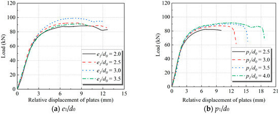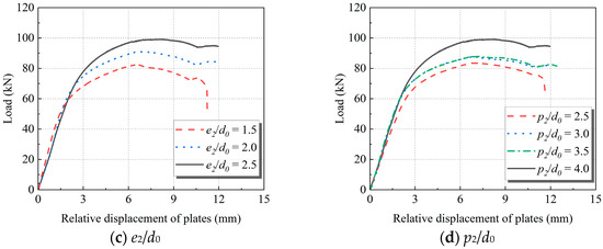 Within the scope of the experimental study, the specimen damage pattern shown in Figure 13 is similar where the sleeve of the BOM-bolt is sheared off, and the aluminum plate undergoes compression damage at the bolt hole. The load (F)-relative plate displacement (Δ) curves obtained from the test are shown in Figure 14. The trend of the curve reveals that with the increase in e1, e2, p1 and p2, the shear-bearing capacity of the connected members increases. The curves of the variation of the ultimate bearing capacity, Pu, and the increase in the test parameters are shown in Figure 15. Among the four parameters, the increase in the distances perpendicular to the load, e2 and p2, results in the most obvious improvement of the bearing capacity. When e2 and p2 are increased by 66% and 58%, respectively, Pu increases by 20% and 18%. When the spacing parallel to the load direction, p1, is increased by 61%, Pu increases by 11%. e1 has the least influence on the bearing capacity. e1, which has the least influence on the bearing capacity, is increased by 75%, and Pu increases by 12% only.
