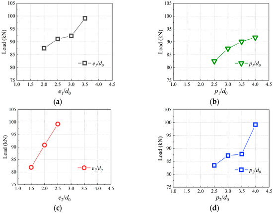 Curves of ultimate bearing capacity changing with test parameters. (a) e1/d0. (b) p1/d0. (c) e2/d0. (d) p2/d0.