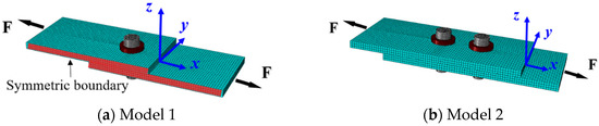 The finite element model is constitutive of three parts: bolt pin, sleeve and aluminum plate, as shown in Figure 16. Because Model 1 is completely symmetric about the symmetry boundary to the left and right, one-half of the test specimen is used as the FEA model to improve the calculation efficiency. The constitutive model of each component is the double-fold model. The connecting plate is 6061-T6 aluminum alloy, and the mechanical properties of BOM-bolts are taken according to the properties of A325 bolts.