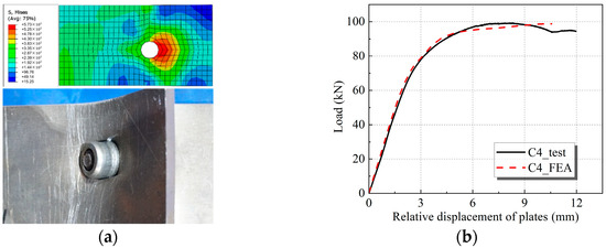 Comparing the damage modes of the finite element analysis and test (Figure 16a), it can be seen that the experimental results match the FEA ones, and the damage mode is bearing damage at the holes of the connection plate. The comparison results of F-Δ curves (Figure 17b) indicate that the errors of shear stiffness and ultimate shear bearing capacity obtained from FEA and test are within 5%, as shown in Table 7.