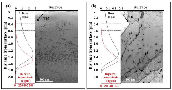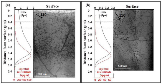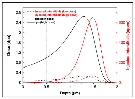 Ion irradiations were performed in the Ion Beam Center at Helmholtz-Zentrum Dresden-Rossendorf using a 3 MV tandetron accelerator. Fe2+ ions with an energy of 5 MeV were implanted into the polished side of the samples. In order to investigate the effect of different doses in the unit of displacement per atom (dpa), the binary collision code Stopping and Range of Ions in Matter (SRIM) version 2013.00 was applied to calculate the doses and corresponding ion fluences. The calculations were based on the quick Kinchin–Pease calculation suggested by [27]. The depth profile of the dose, given in dpa, and injected interstitials, given in atomic parts per million (appm), calculated by SRIM, are plotted in Figure 1. The depth range around 0.5 µm can be considered as the “safe zone” due to the almost complete absence of injected interstitials. A summary of irradiation conditions is listed in Table 2. Two irradiation conditions resulting in 0.1 dpa (low dose) and 1 dpa (high dose) at the depth of 0.5 µm (reference depth, dotted line in Figure 1) were applied for both materials using the same dose rate (dose rate at 0.5 µm: 4.67 × 10−5 dpa/s, flux: 1.25 × 1011 cm−2/s).
