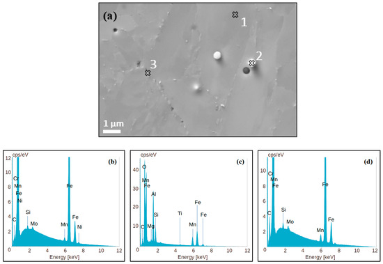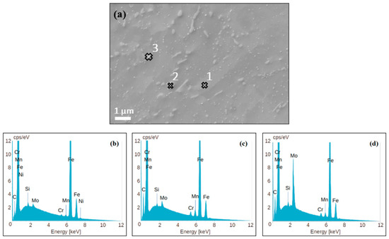 Figure 5a displays the overview SE micrograph of the area on ANP-10, the crosses with numbers indicate the spots at which EDX spectra have been collected. Figure 5b shows a spectrum from the metal matrix as a reference. Figure 5c,d display the spectra of the chosen particles. All identified particles in ANP-10 are carbides. Most of the larger carbides are predominantly enriched with Mn and contain some excess Mo and Cr (e.g., position 2). Some of the smaller carbides are predominantly enriched with Mo (e.g., position 3), and show a little excess of Mn and Cr, too.