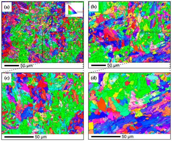 EBSD IPF-Z mappings of (a) ANP-6 overview, (b) ANP-10 overview, (c) ANP-6 detail, and (d) ANP-10 detail.